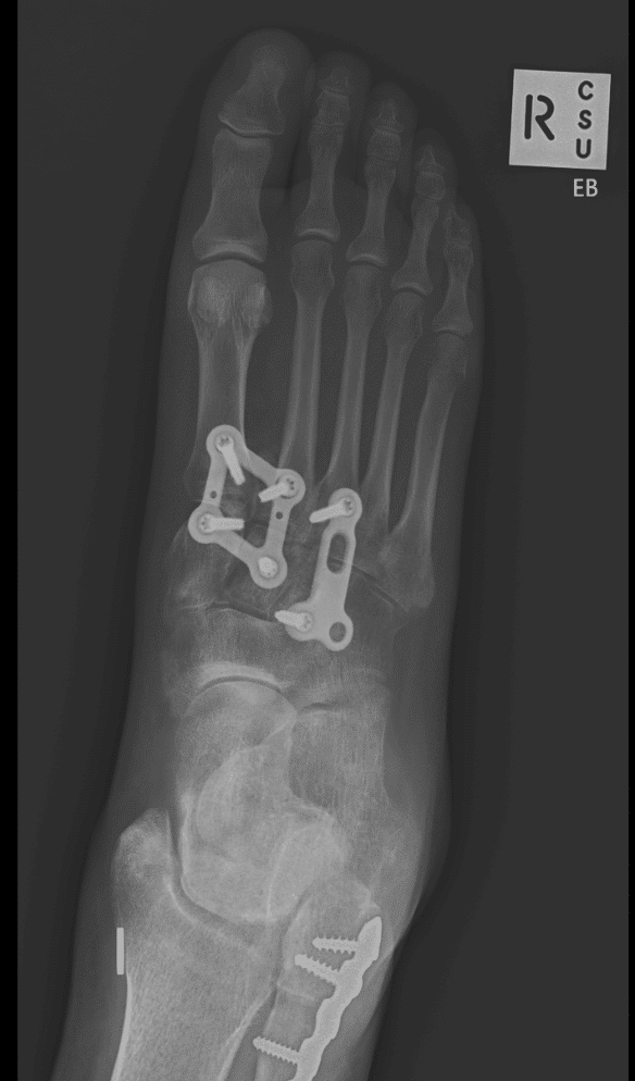 Surgery involves incisions on the top of the foot and mobilisation if the nerves and arteries supplying the toes. An area of numbness over the scar and distant to this is expected but will reduce with time. X-ray in the operating theatre is used to ensure the stabilisation of the affected joints and position of metal fixation which is designed so that it can stay in the foot for the long time it takes for this injury to heal.
